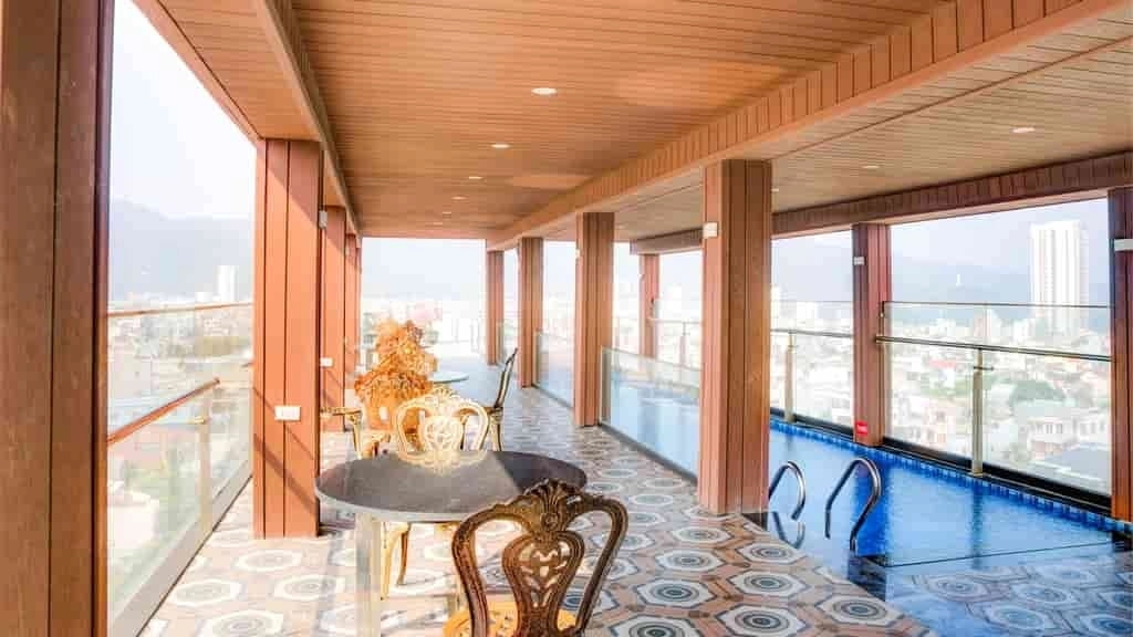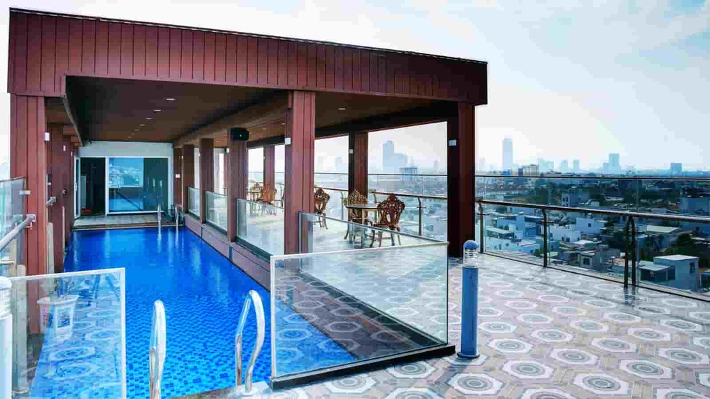Hồ bơi nằm trên tầng thượng của khách sạn, đây được xem là dụng ý của nhà thiết kế khi muốn du khách chiêm ngưỡng toàn cảnh của thành xinh đẹp Đà Nẵng. Hồ bơi có thiết kế hiện đại với làn nước trong xanh, không gian mở cùng khu vực bàn ghế để bạn thoải mái dùng trà hay ăn nhẹ sau khi vận động bơi lội.
