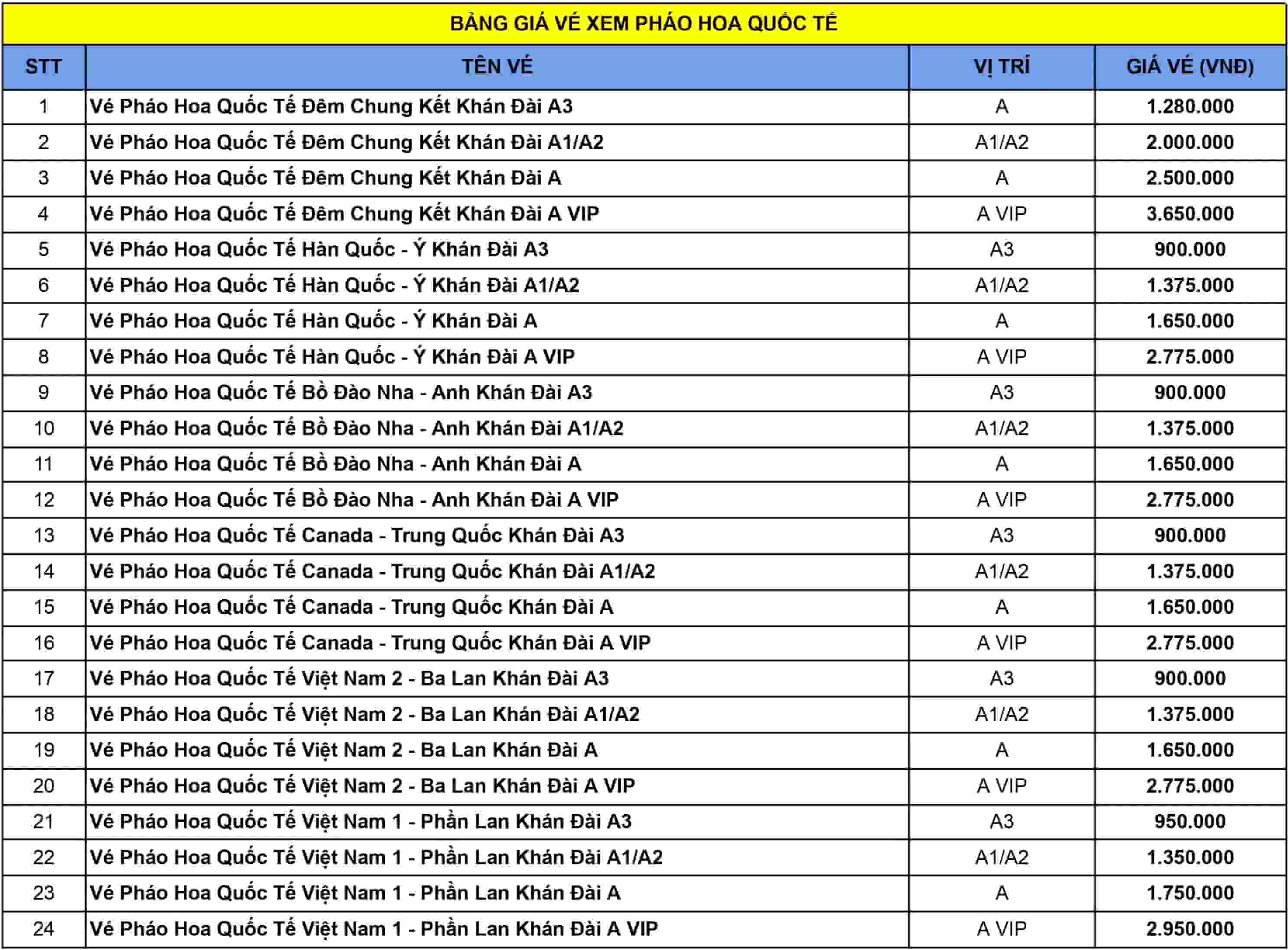 Kể từ bây giờ bạn không còn phải lo lắng về việc tìm kiếm vé pháo hoa quốc tế. Phan Văn hiện có nhiều hạng vé cho bạn lựa chọn, tham khảo ngay bảng giá dưới đây: