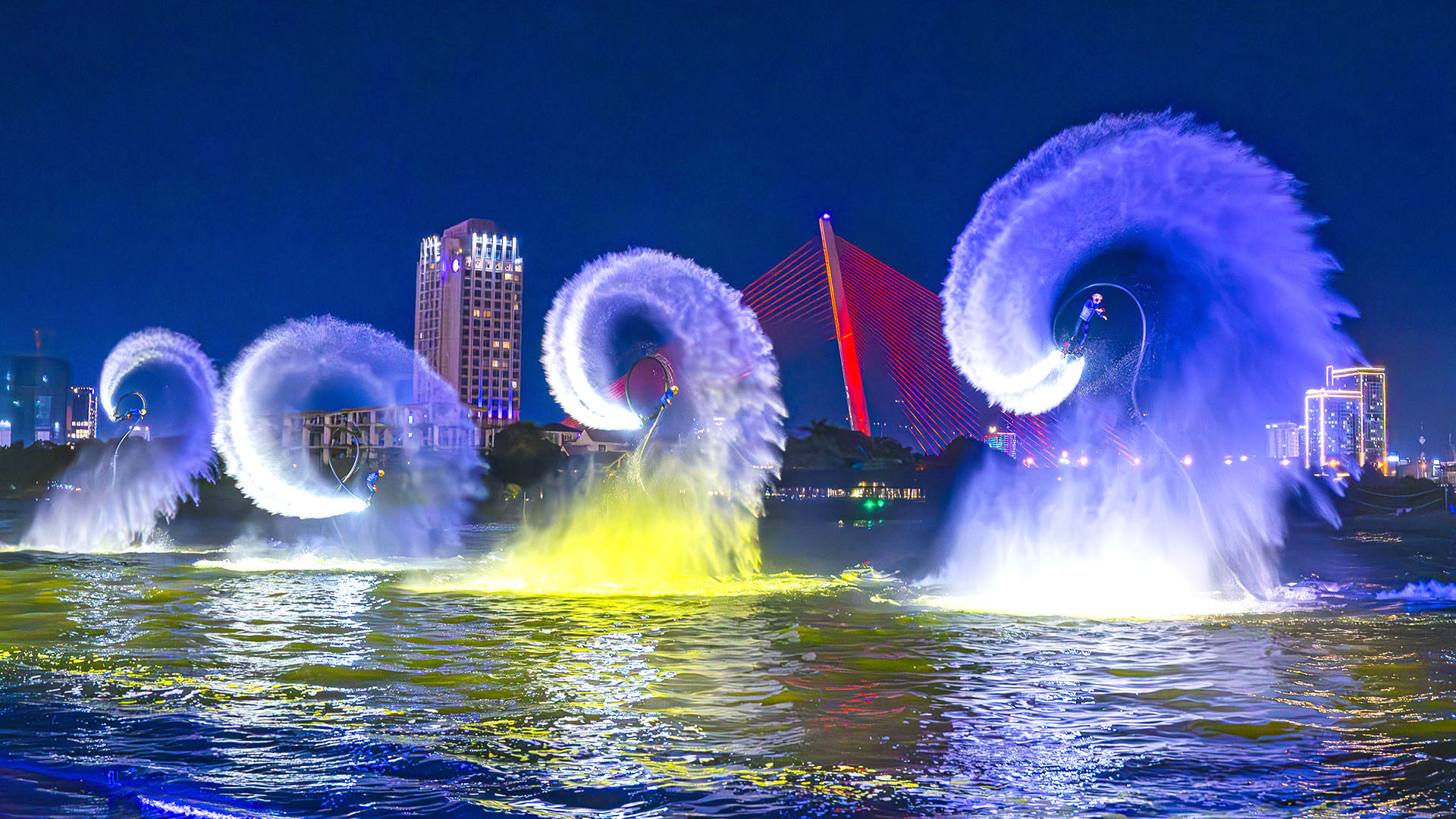 Du khách sẽ được chiêm ngưỡng màn trình diễn các môn thể thao: flyboard, mô tô nước, thuyền buồm, nơi mà các vận động viên lướt trên mặt nước, bay cao vút trên không trung nhờ lực đẩy mạnh mẽ. Cùng với đó là, các cuộc đua mô tô nước, với những pha rượt đuổi tốc độ cao trên mặt biển, thu hút đông đảo khán giả theo dõi.