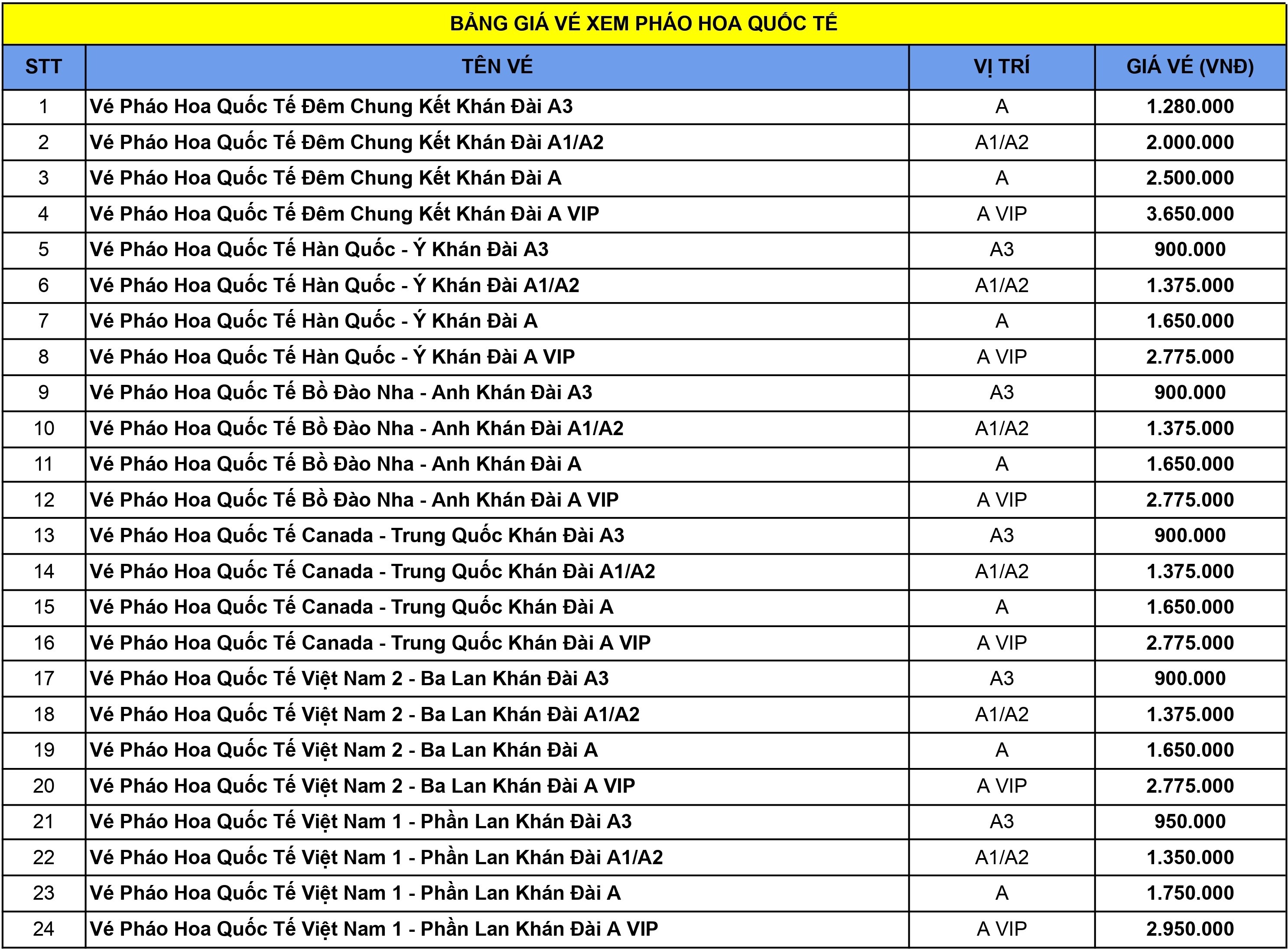 Lưu ý: Giá vé pháo hoa sẽ thường xuyên thay đổi theo tình trạng thị trường.