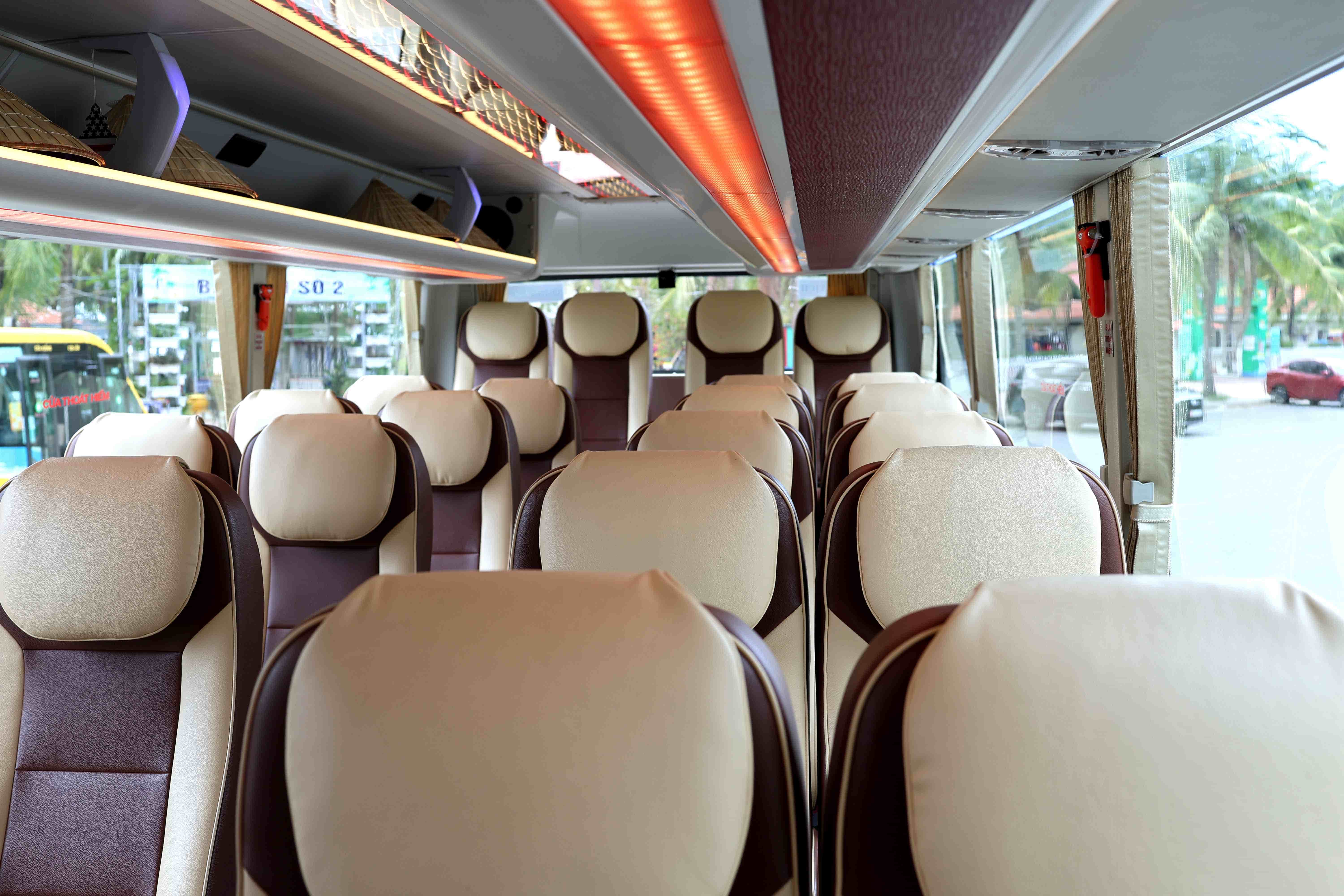 Xe 29 chỗ có kích thước vừa phải, tạo cảm giác rộng rãi nhưng vẫn dễ di chuyển trên các cung đường đèo núi giữa Đà Nẵng và Pleiku. Ghế ngồi êm ái, khoảng cách giữa các hàng ghế hợp lý giúp hành khách có thể ngả lưng thư giãn trong suốt hành trình.