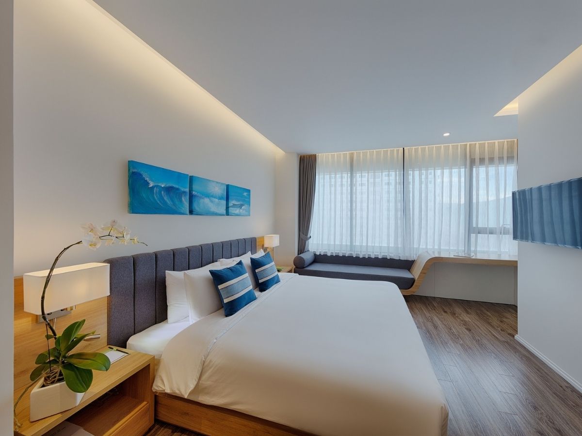 BlueSun nổi bật với thiết kế hiện đại, không gian mở, mang đến sự đẳng cấp cho khách hàng. Với 110 phòng nghỉ được trang bị đầy đủ tiện nghi, mỗi phòng đều có ban công riêng, cho phép khách hàng tận hưởng tầm nhìn toàn cảnh ra biển hoặc thành phố.