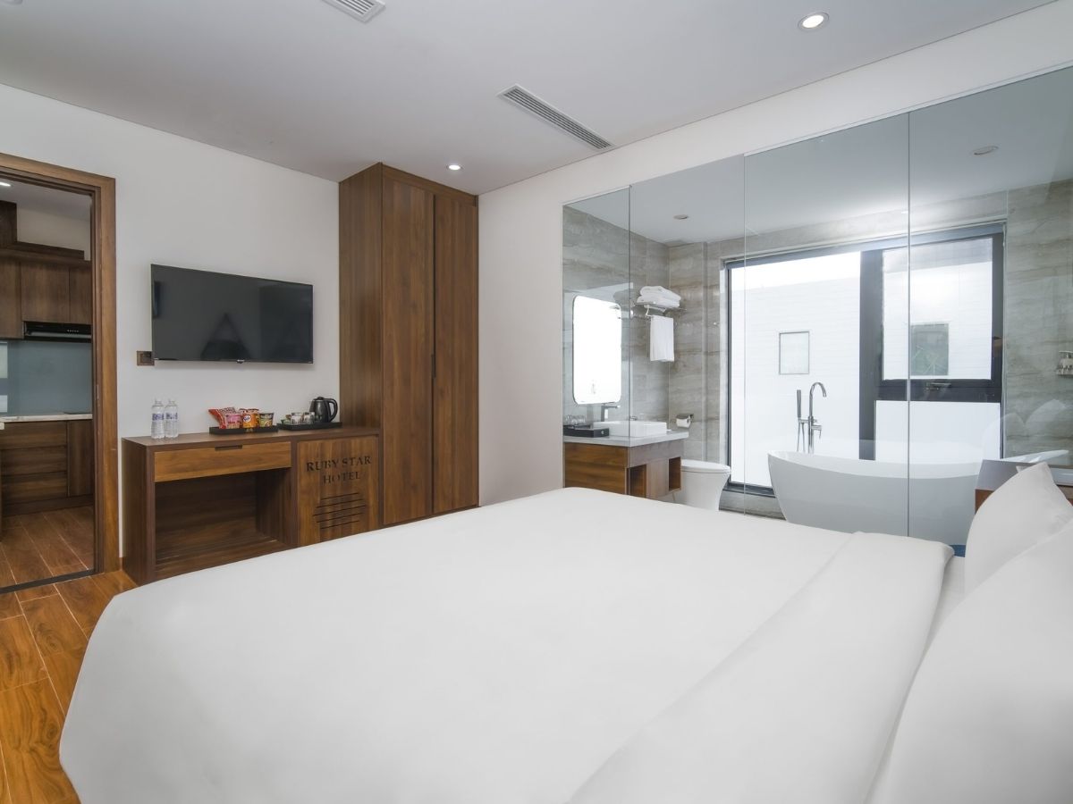 Ruby Star Hotel Đà Nẵng có nhiều hạng phòng để lựa chọn như Luxury Apartment, Executive Suite, Suite Seaside với bồn tắm hay Deluxe City View. Mỗi phòng đều được trang bị tiện nghi hiện.
