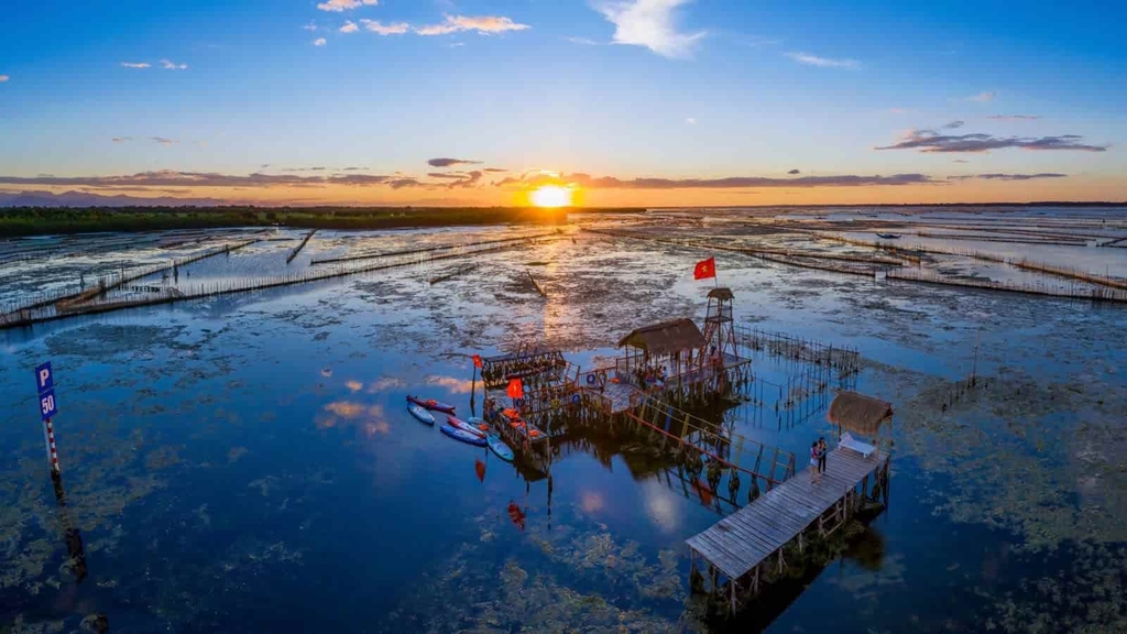 Buổi chiều: 14h30: Xe và HDV sẽ đón du khách tại khách sạn trung tâm thành phố Huế. Hành trình “Chiều trên Phá Tam Giang ” bắt đầu: Du khách băng qua những con đường rộng lớn với 2 bên đường là những đồng lúa bạt ngàn, mùi thơm của những bông lúa nặng trĩu sữa vào độ tháng 4, tháng 5 thoang thoảng sẽ làm du khách gợi nhớ đến tình yêu quê nhà. Băng qua cây cầu ngăn mặn Đập Thảo Long – là nơi giao thoa giữa vùng nước mặn và vùng nước ngọt, du khách phóng tầm mắt ra xa sẽ nhìn thấy toàn cảnh Phá Tam Giang: những làng chài cổ hoang sơ, những đầm hải sản nhuộm màu xanh biếc. Xe đưa du khách đến với Phá Tam Giang – Đầm Chuồn. Đến nơi, du khách lên thuyền (ghe) để bắt đầu hành trình khám phá sông nước Phá Tam Giang. Dạo quanh 1 vòng trên phá bằng thuyền, du khách sẽ choáng ngợp bởi vẻ đẹp hoang sơ, phóng khoáng nhưng vẫn phảng phất hơi thở trầm mặc đặc trưng của đất Huế. Lúc hoàng hôn buông xuống, sắc tím của bầu trời cuối ngày phủ khắp những đầm phá nuôi tôm, đâu đó xuất hiện hình ảnh các chú ngư dân đang cần mẫn mò tôm, bắt cá để chuẩn bị cho bữa cơm tối.
